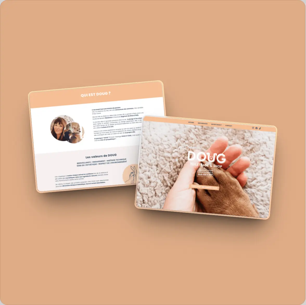 L’objectif principal de Doug Toilettage & Shop est de proposer une expérience digitale aussi chaleureuse et soignée que celle vécue en boutique. Le site met en valeur le savoir-faire de Clio, la fondatrice, et la qualité des prestations offertes : toilettage professionnel, soins sur-mesure, boutique éthique et conseils personnalisés.