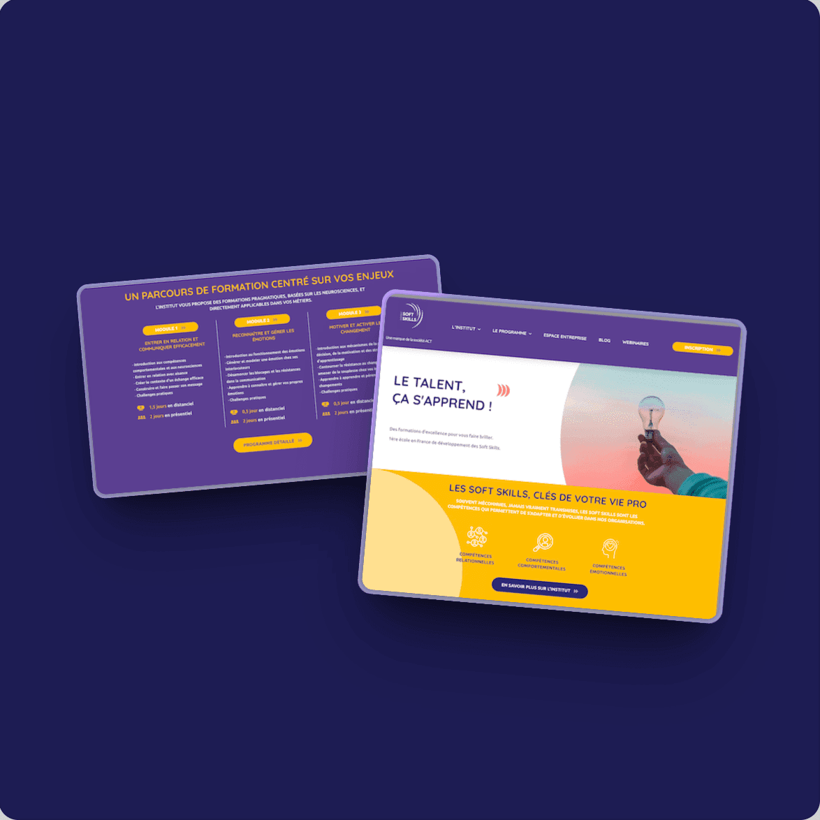L’objectif du site de l'Institut Soft Skills est de valoriser un programme de formation unique en France, fondé sur les neurosciences et la pratique des soft skills. La navigation fluide, l’ergonomie claire et les appels à l’action bien positionnés permettent aux visiteurs de s’inscrire facilement, de découvrir les formateurs et d’explorer le contenu des modules.