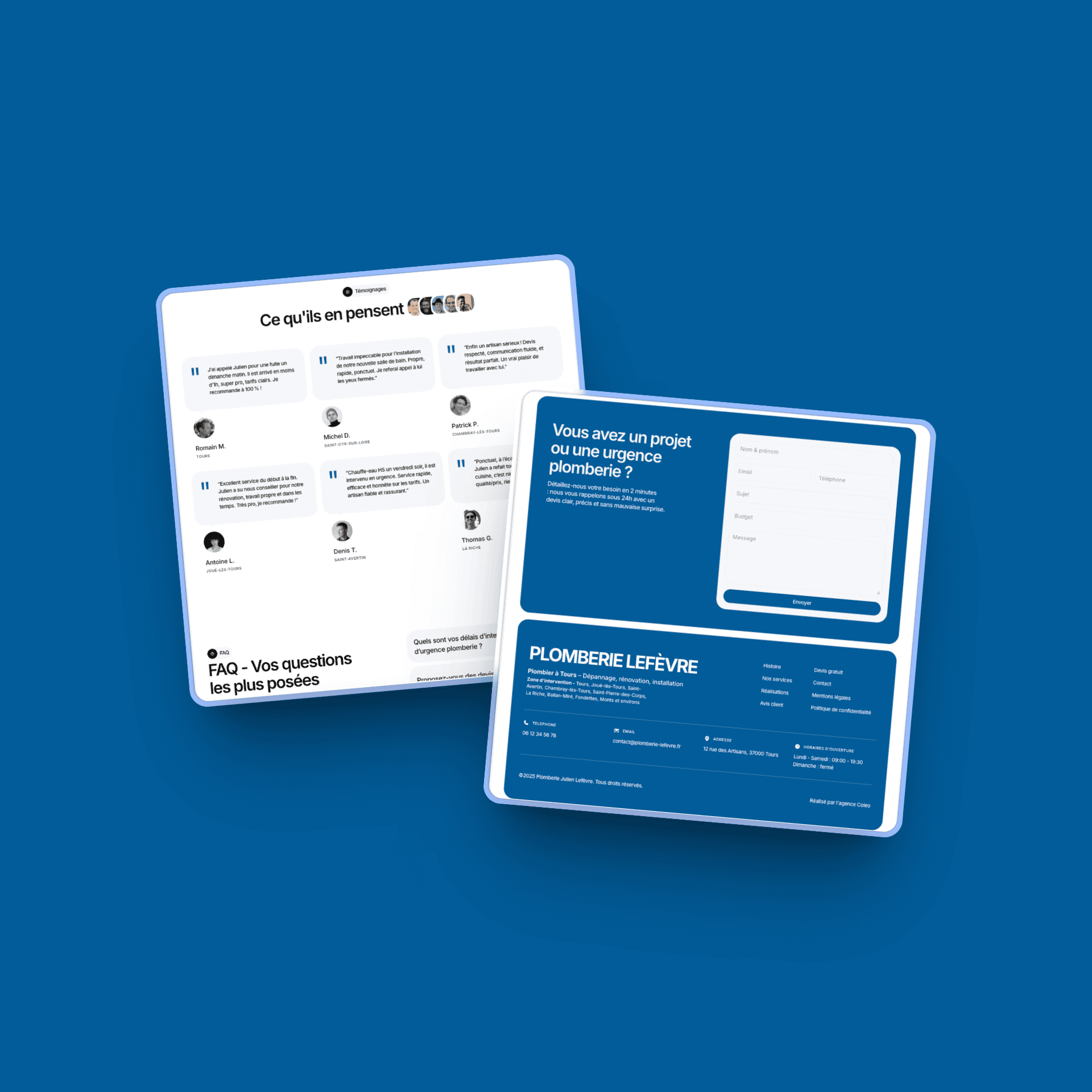 Grâce à une interface claire, une navigation intuitive et un portfolio classé par type de service (installation, rénovation, urgence), le site inspire confiance. L’identité graphique repose sur une palette sobre et professionnelle (bleu, gris, blanc), une typographie nette, et des visuels illustrant des chantiers réels, pour mettre en avant la précision du geste artisanal.