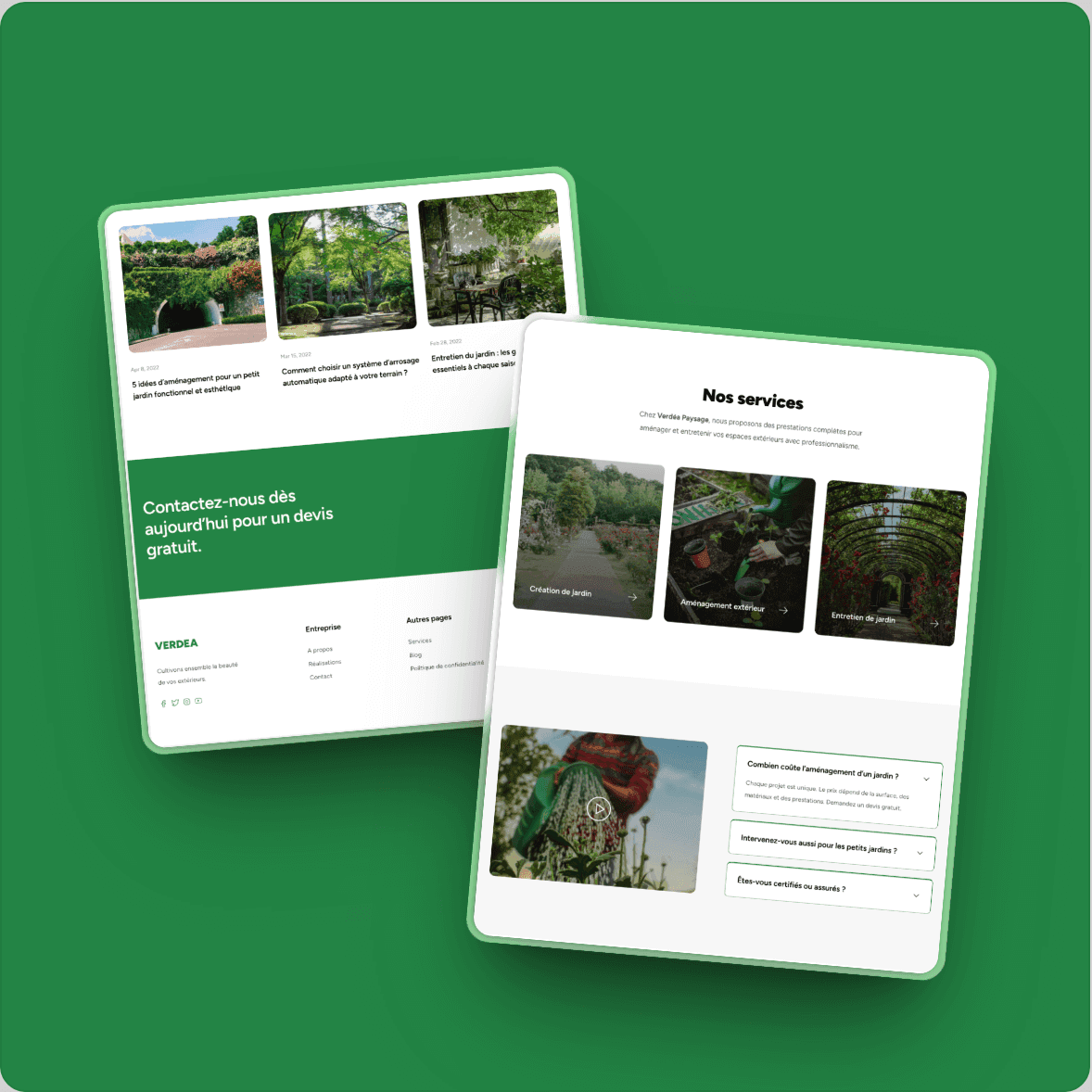 Verdéa Paysage n’est pas seulement une entreprise de paysagisme : c’est un partenaire engagé pour transformer chaque extérieur en un lieu unique et harmonieux. Le site traduit cette vision à travers un design élégant, une structure claire et un storytelling centré sur l’humain et la nature.
