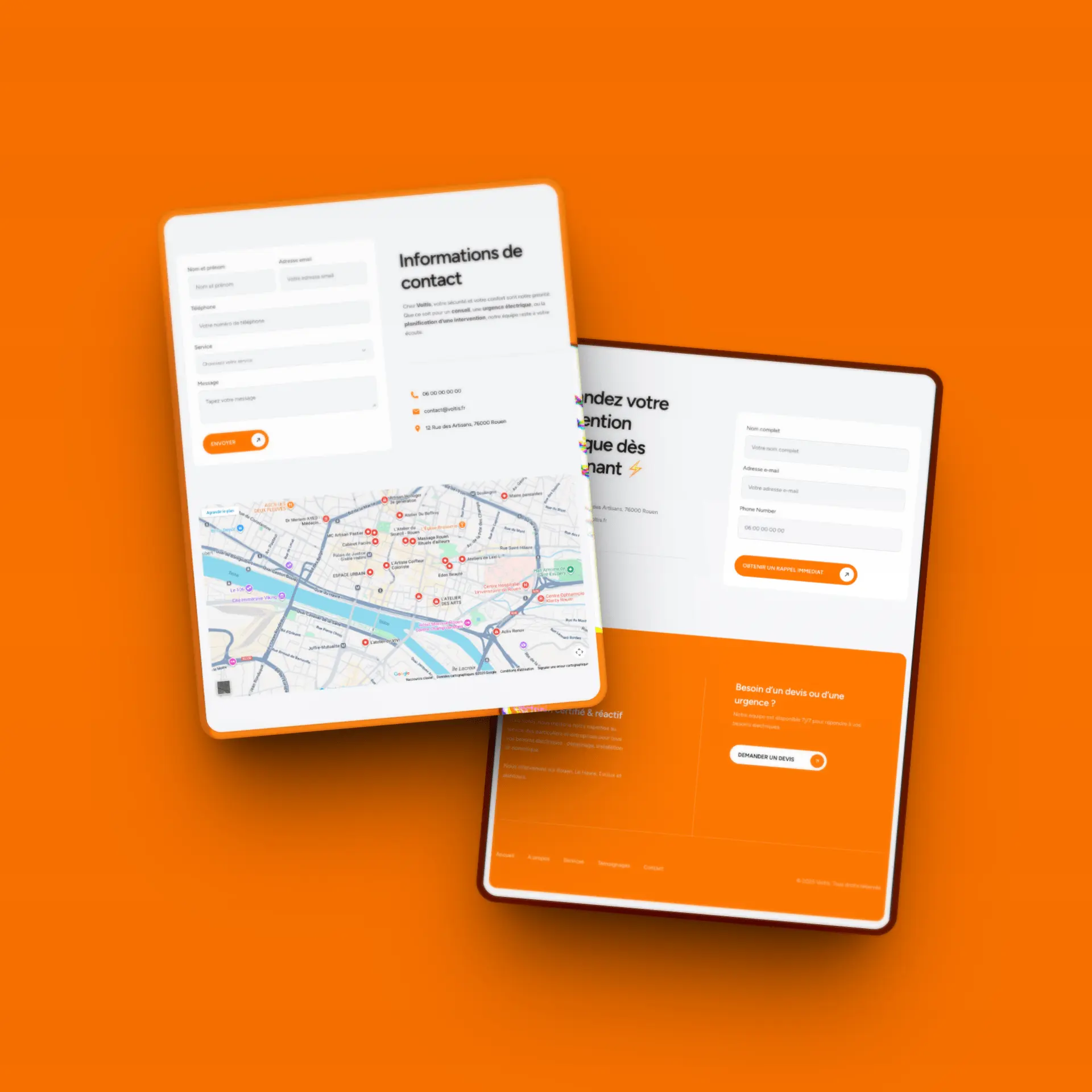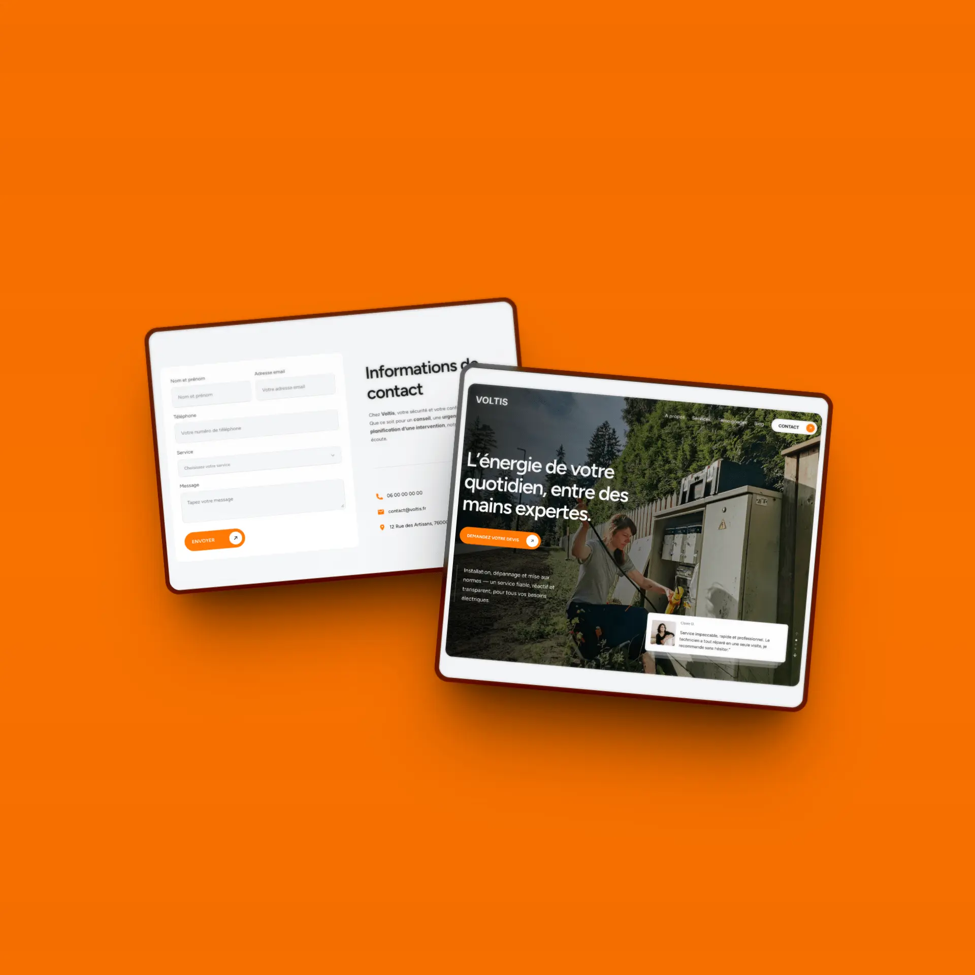 L’identité visuelle, fondée sur un dégradé d’orange énergique et un fond blanc lumineux, reflète la puissance, la précision et la maîtrise de l’énergie — symboles du savoir-faire Voltis.